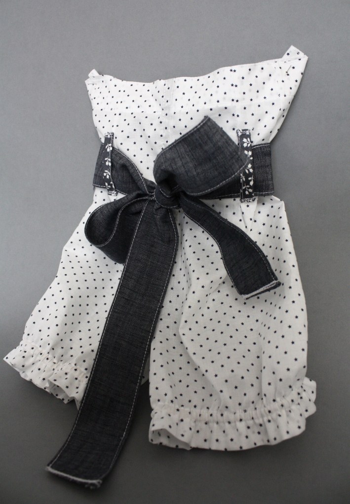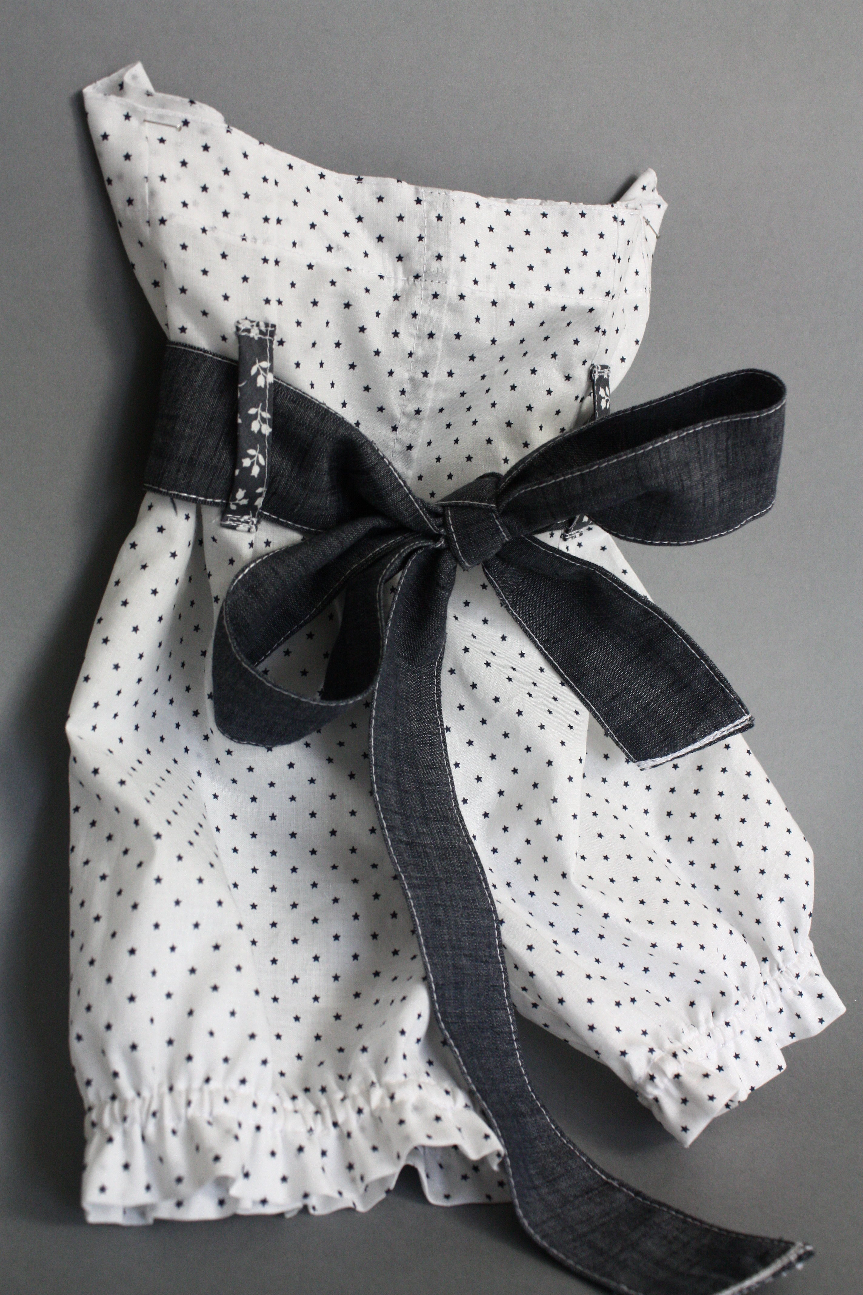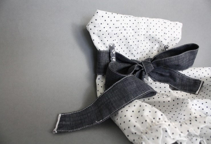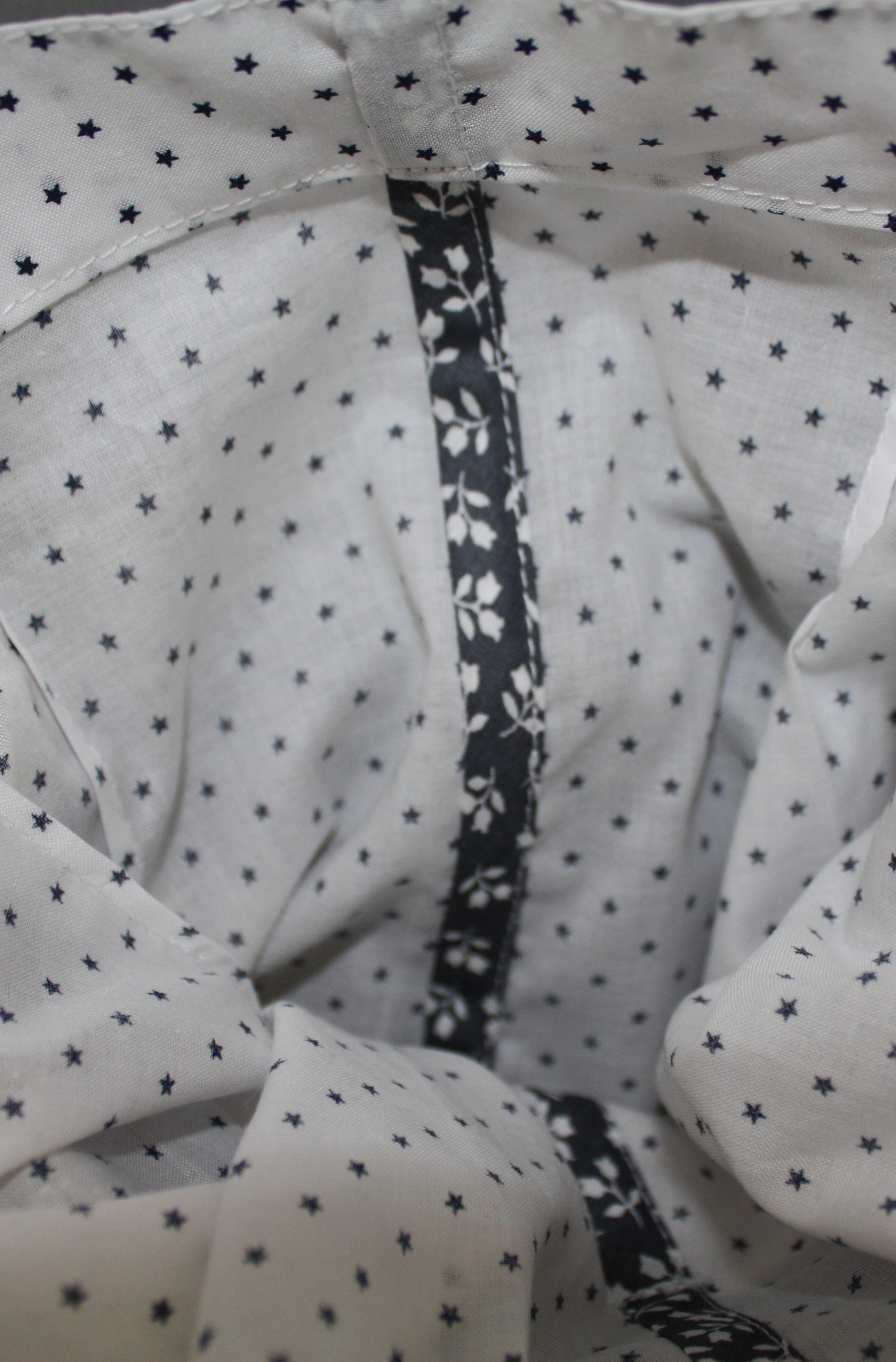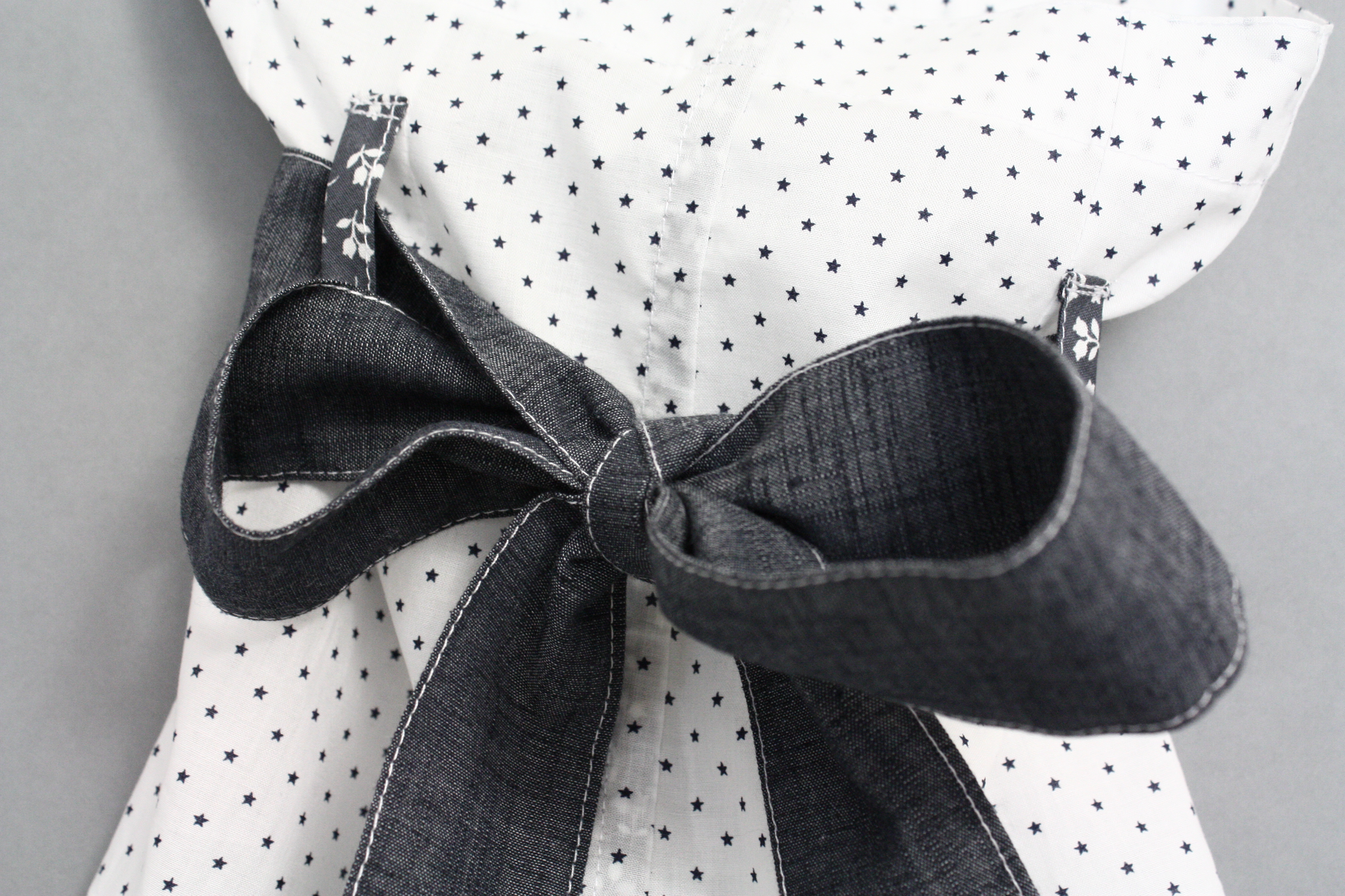 Le tissu est une popeline de coton imprimée à petites étoiles bleu marine, un coupon que j’ai acheté dans la mercerie « L’entrée des fournisseurs » à Paris dans le Marais. La ceinture est faite dans un coton jean souple acheté il y a fort longtemps chez Bouchara. Le biais en liberty vient de chez Reine.