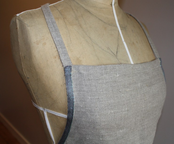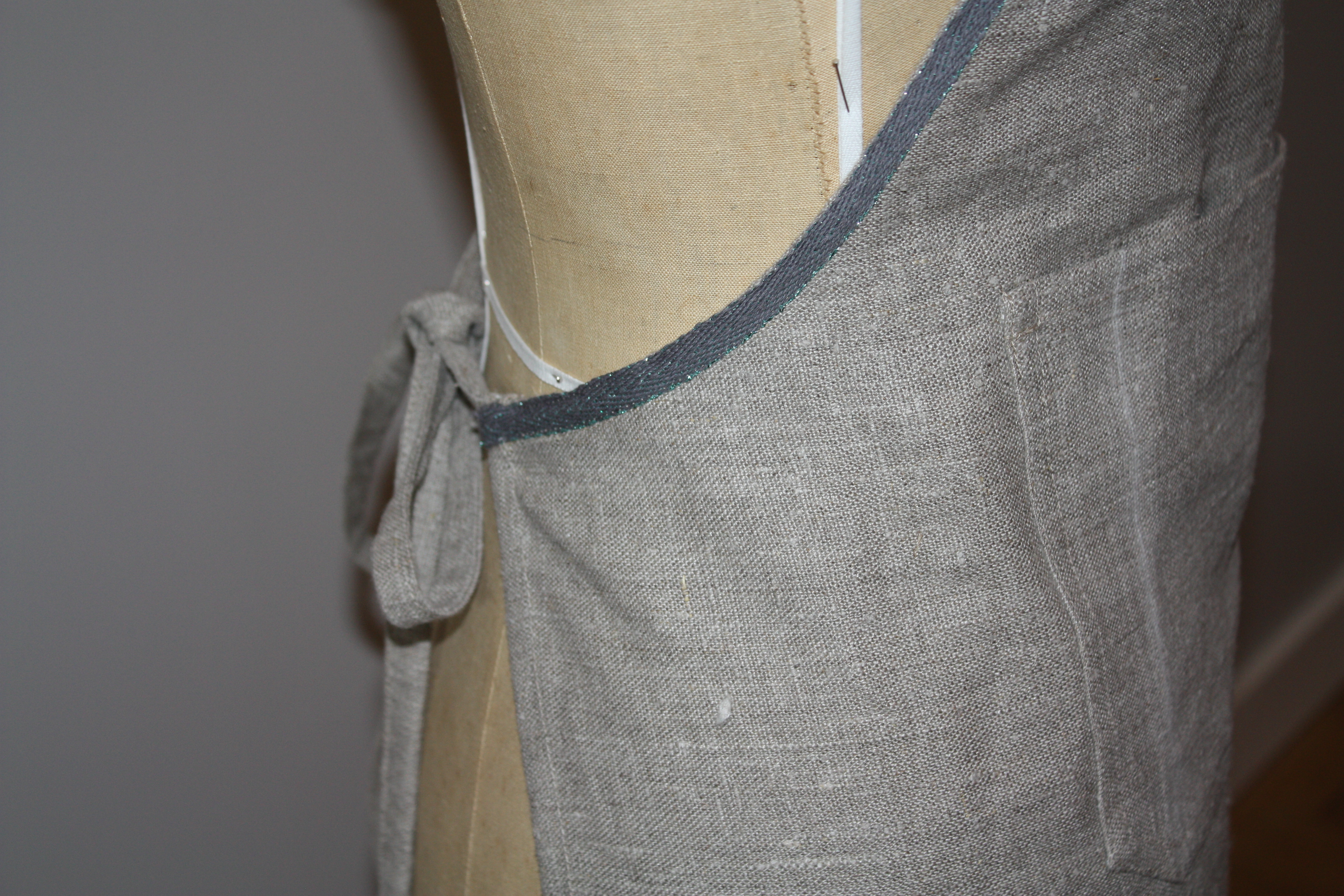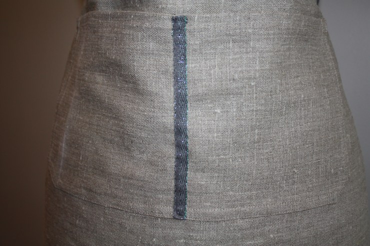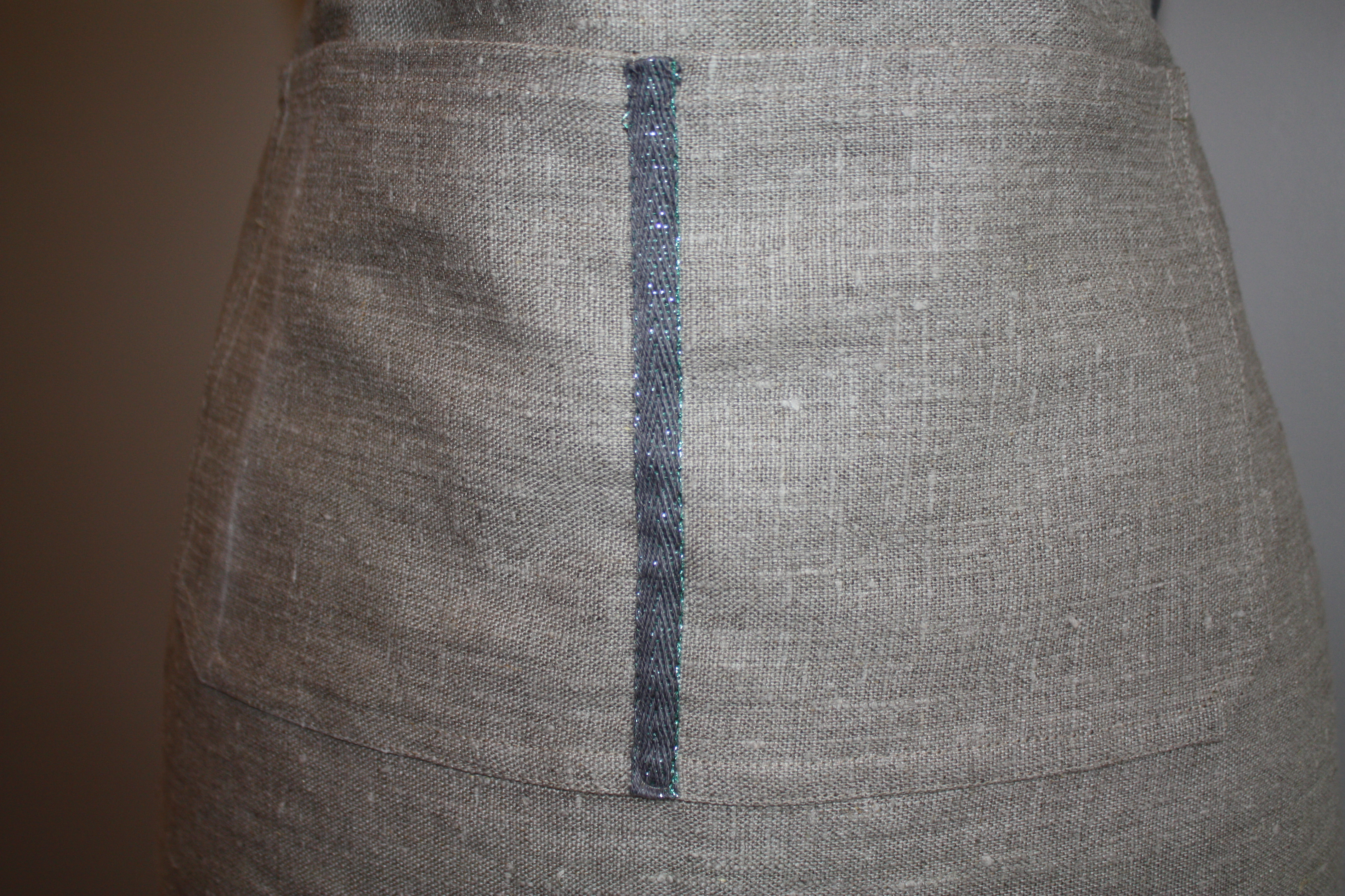 J’ai cousu le ruban sur la poche finie en traversant l’épaisseur de lin, ainsi ça me fait deux poches en une. Les rubans sont rabattus à la main aux extrémités pour éviter une couture machine, ce qui donne une finition invisible plus agréable à regarder je trouve.