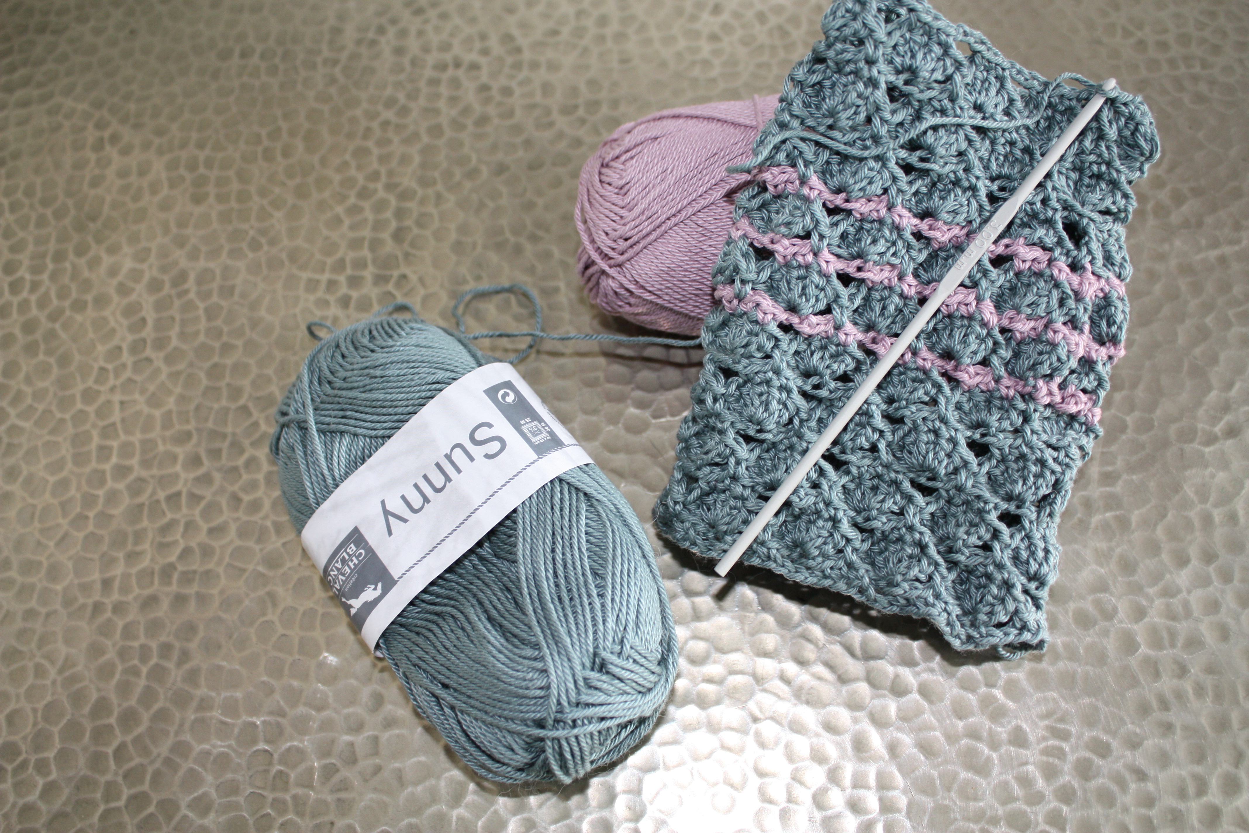 J’ai utilisé du fil 100% coton Sunny de Cheval Blanc et un crochet de 3mm