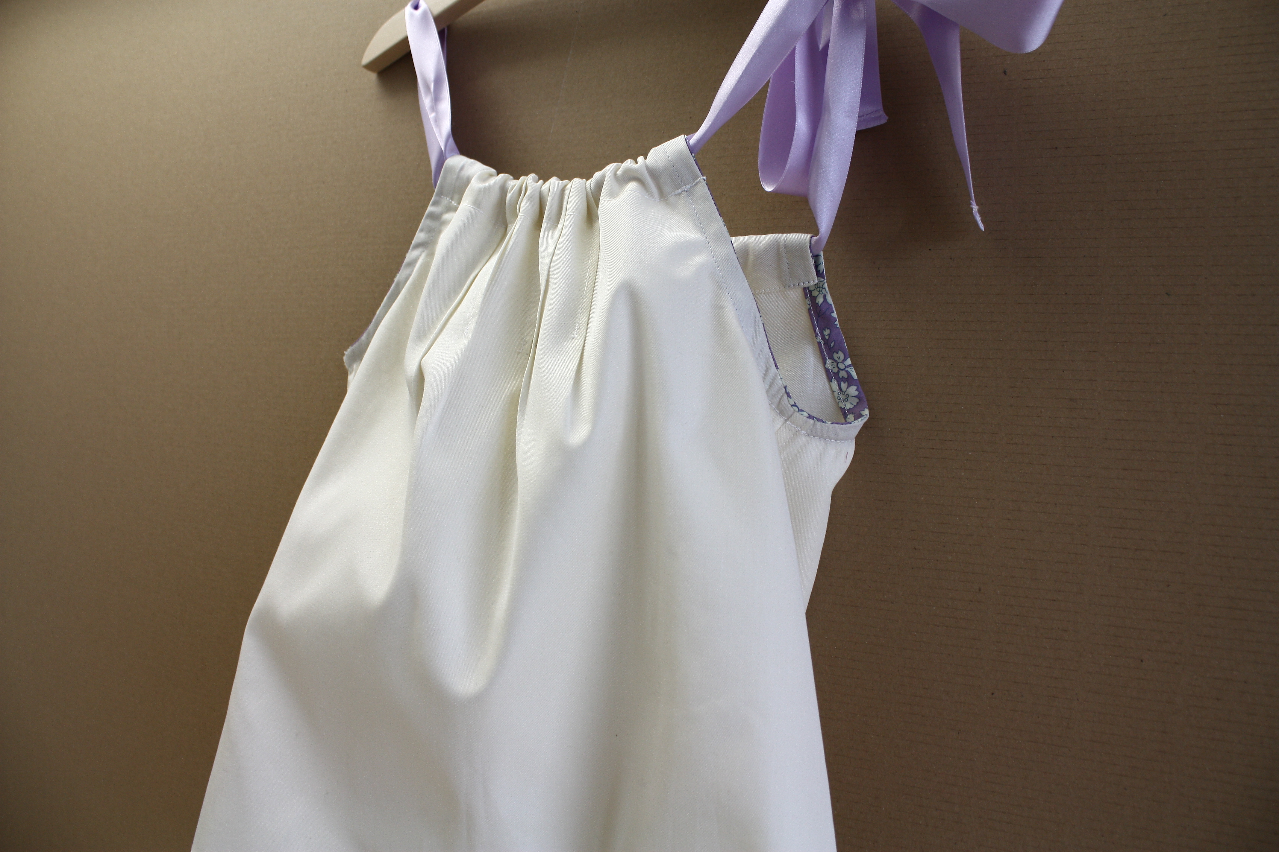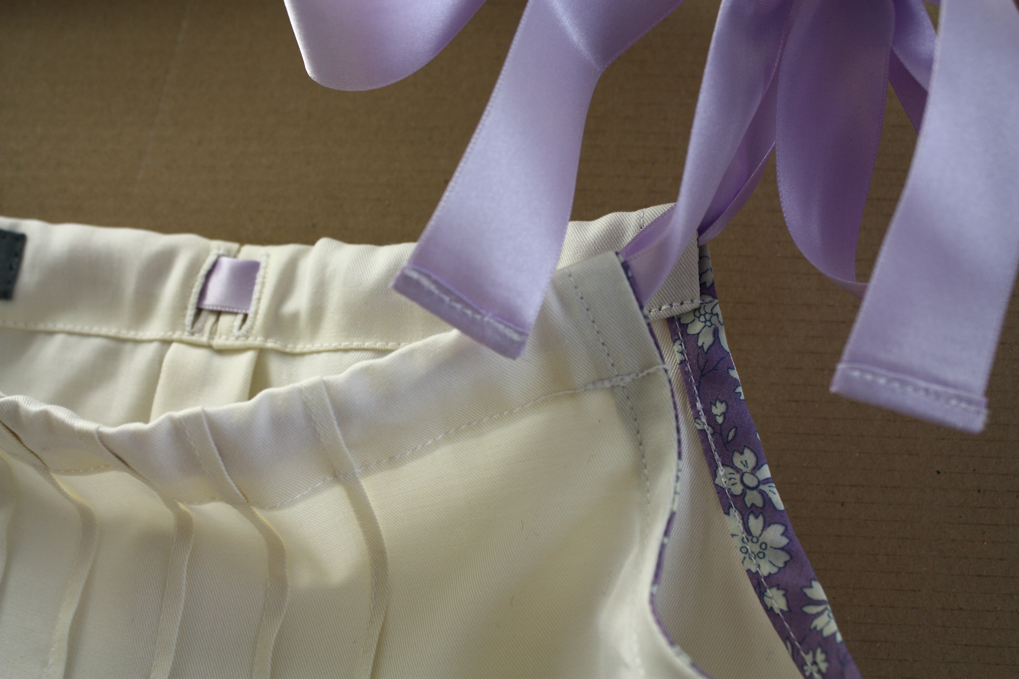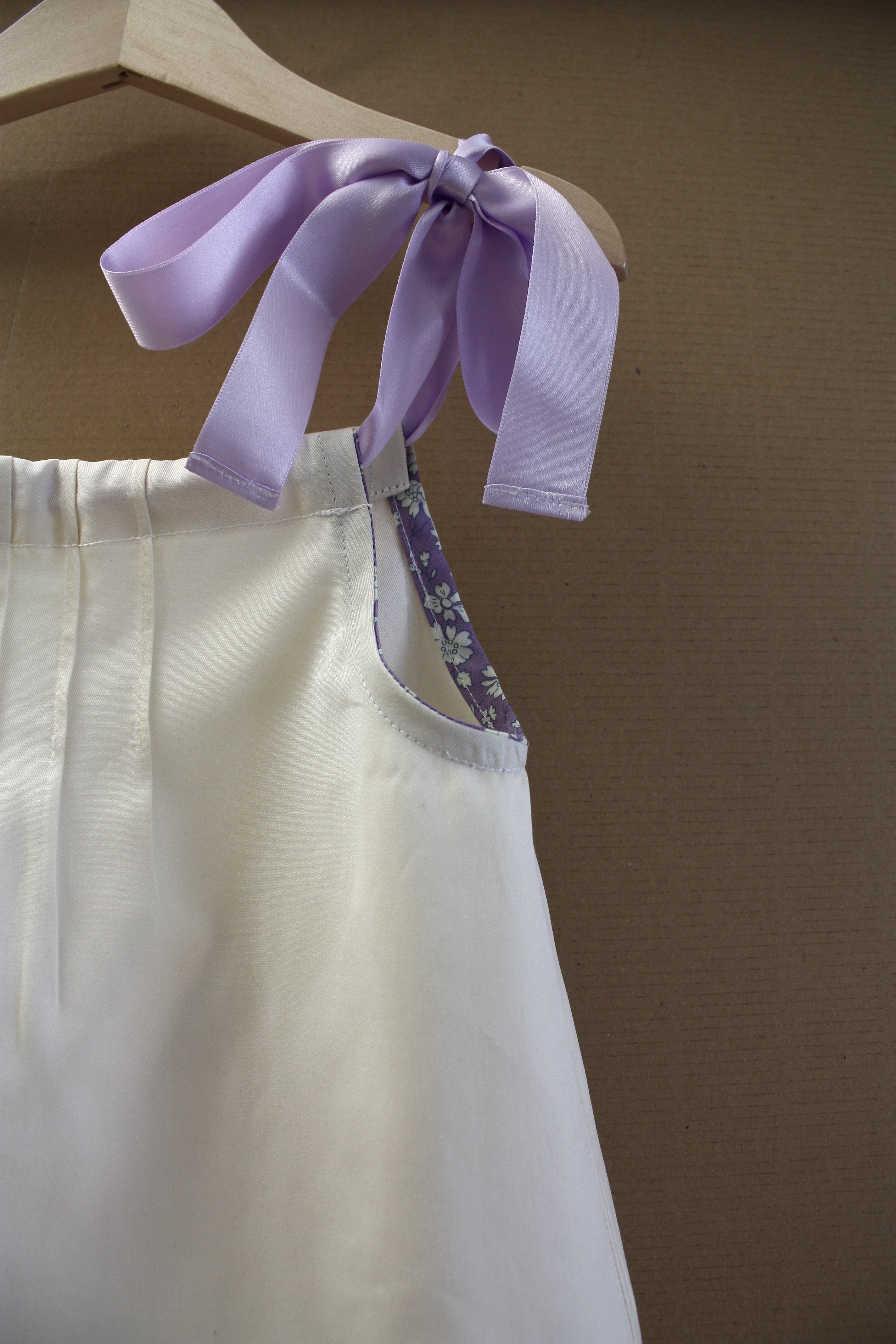 J’ai utilisé une popeline de coton de ma réserve, du biais liberty parme acheté chez Moline Mercerie, du ruban de satin trouvé chez fil 2000 (65, rue Réaumur 75002 Paris)
