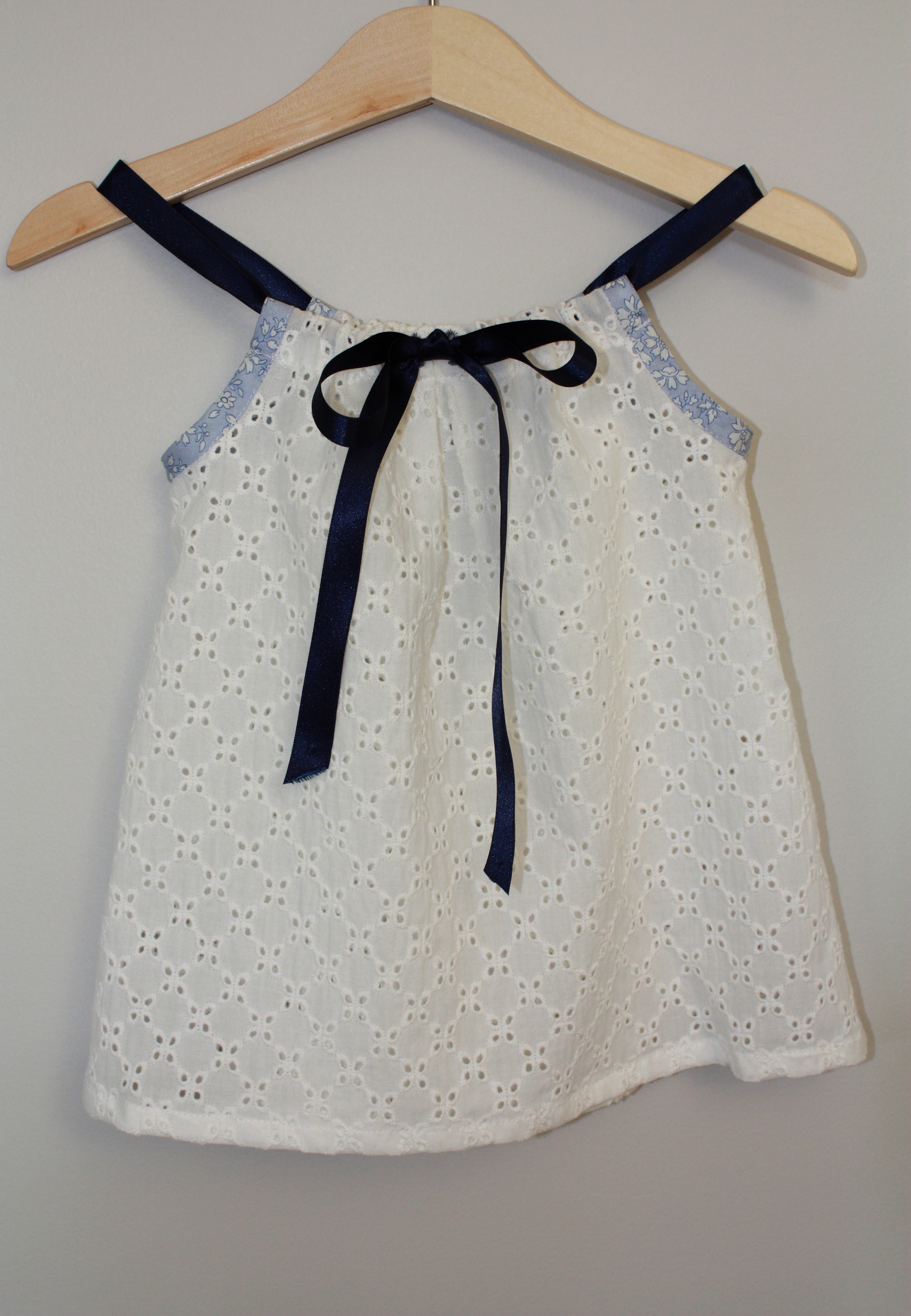 J’ai utilisé de la broderie anglaise 100% coton  L’entrée des fournisseurs, du biais liberty trouvé chez Moline Mercerie et du ruban de satin marine acheté chez Fil 2000.