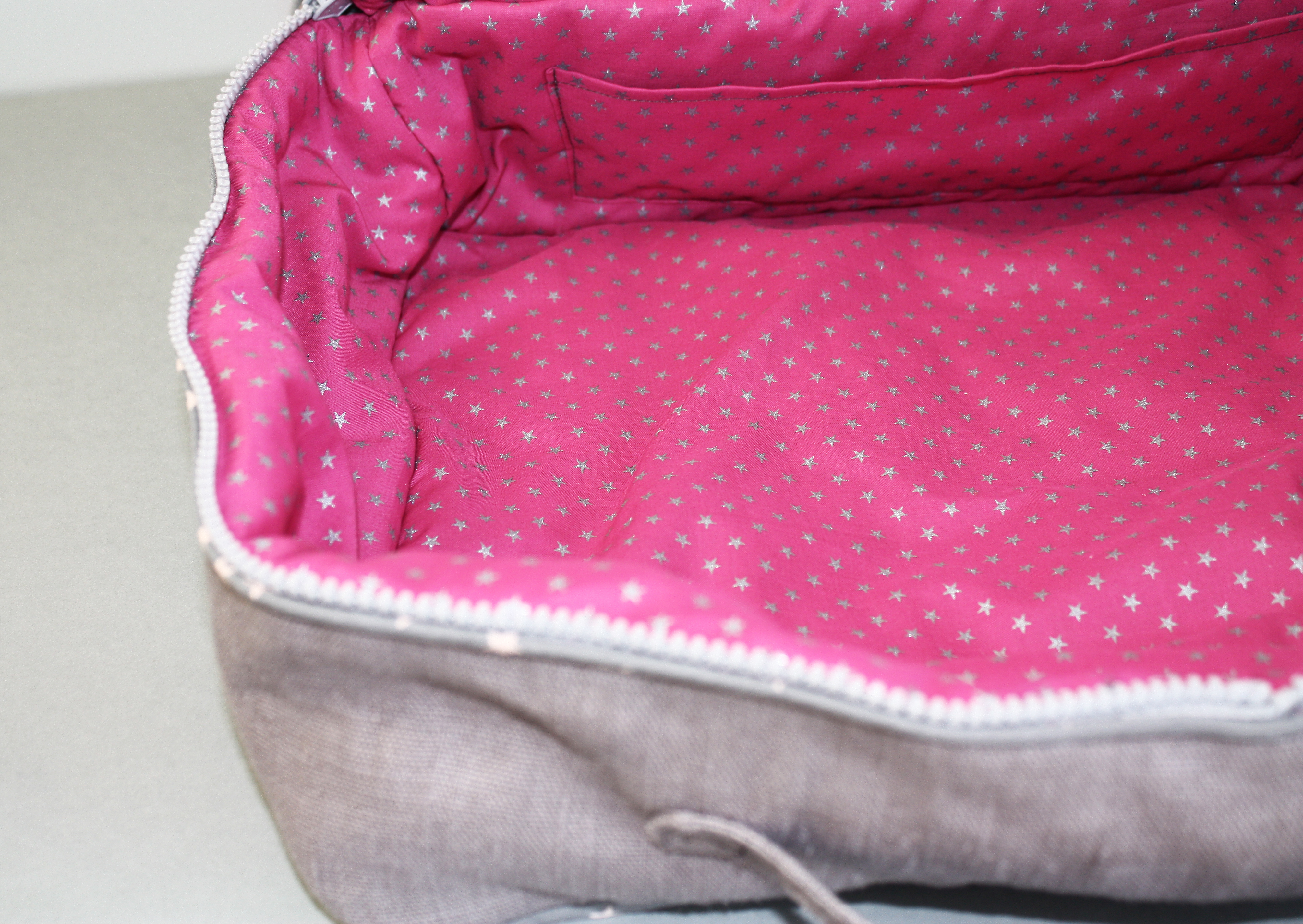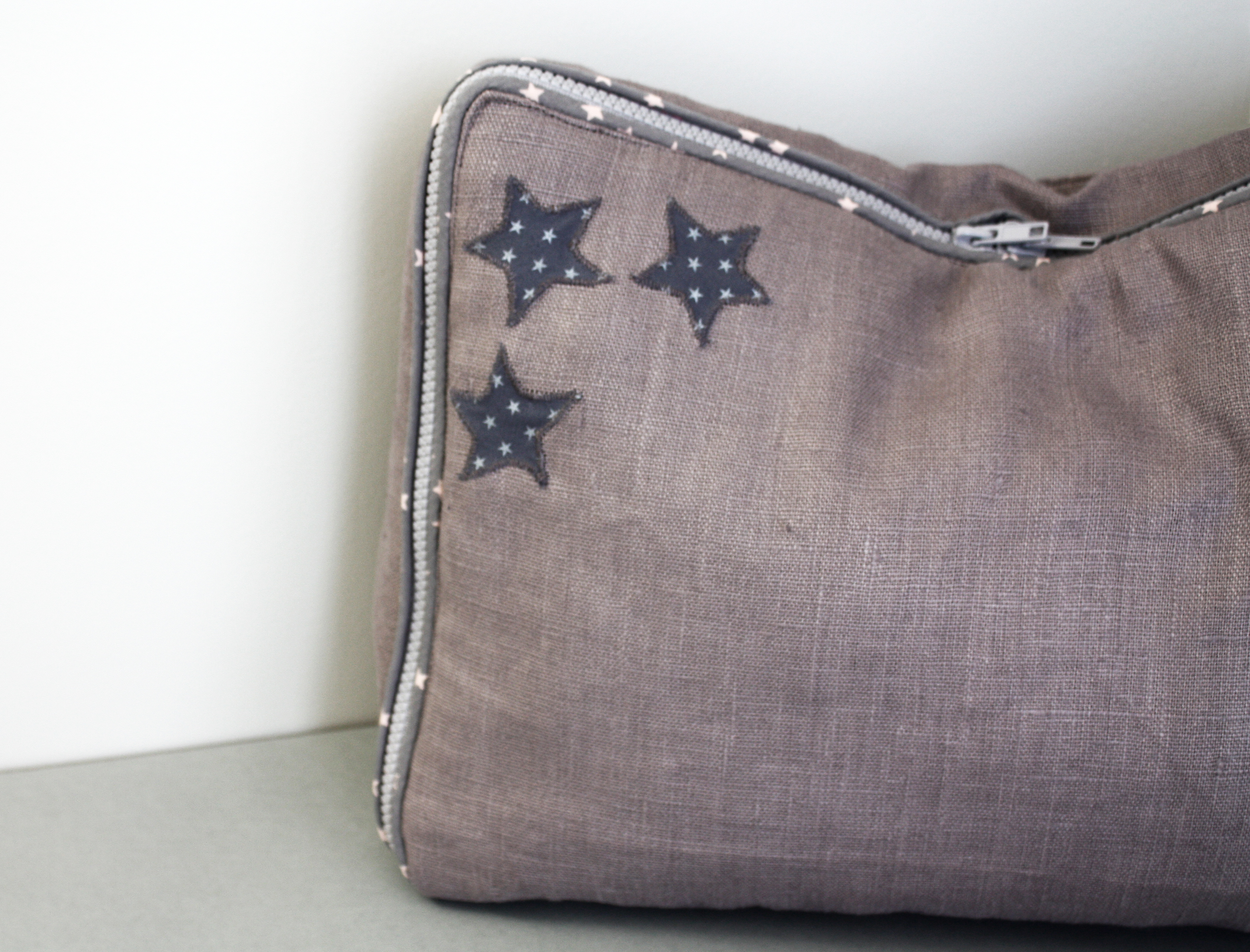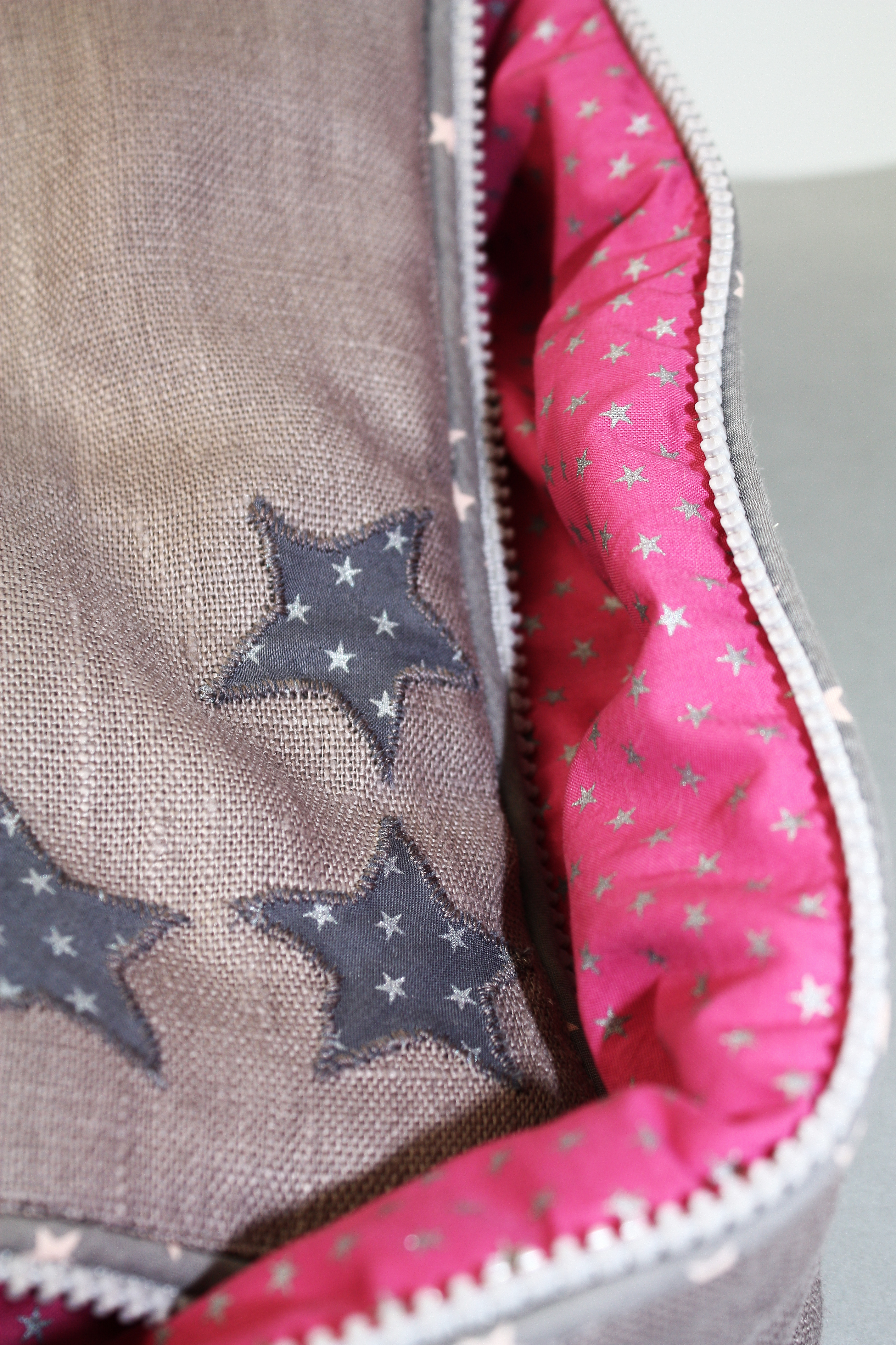 Les fourniture utilisées: – du lin lila Au maison de chez Entrez sans frapper pour l’extérieur – la doublure et les étoiles appliquées sont en batiste fushia et marine à étoiles argent de chez France Duval Stalla – le biais qui a permis la fabrication du passepoil est également de chez France Duval Stalla – j’ai utilisé deux zips séparables trouvés chez Reine, mais le mieux serait un grand zip séparable de 90 cm que je n’ai pas trouvé dans le commerce – du molleton mou:)  – de la cordelette de lin de 5mm de diamètre que j’ai trouvé chez Mode et Travaux