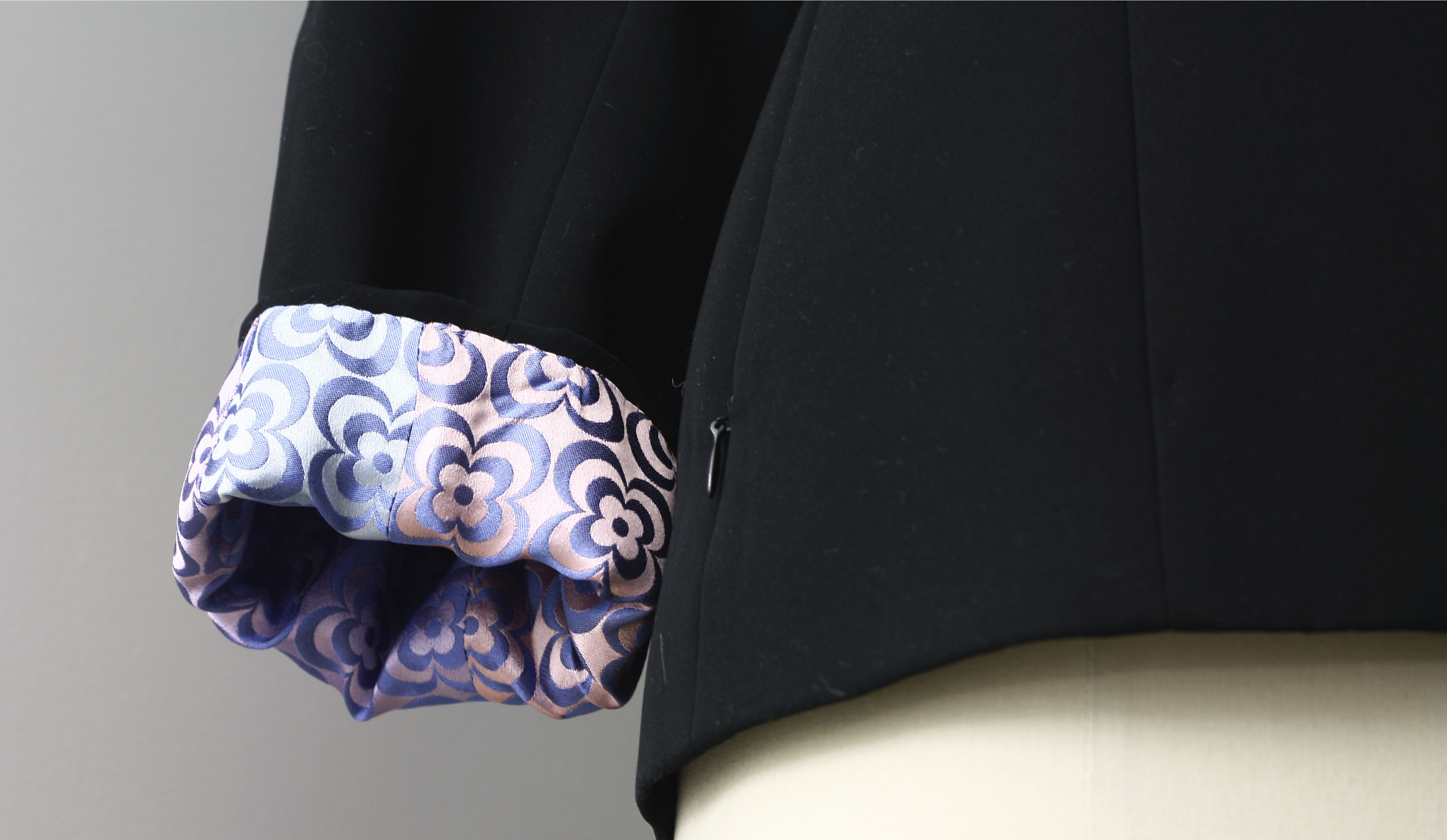 Puis j’ai attaqué les doublures des manches pour que la soie puisse apparaitre en faisant un revers. J’ai coupé des morceaux de soie de la largeur des bas de manches et d’une longueur plus profonde que le revers que je prévoyais de faire. Puis j’ai bâti ces morceaux à la main sur l’envers avant de les fixer au point de rabattement.