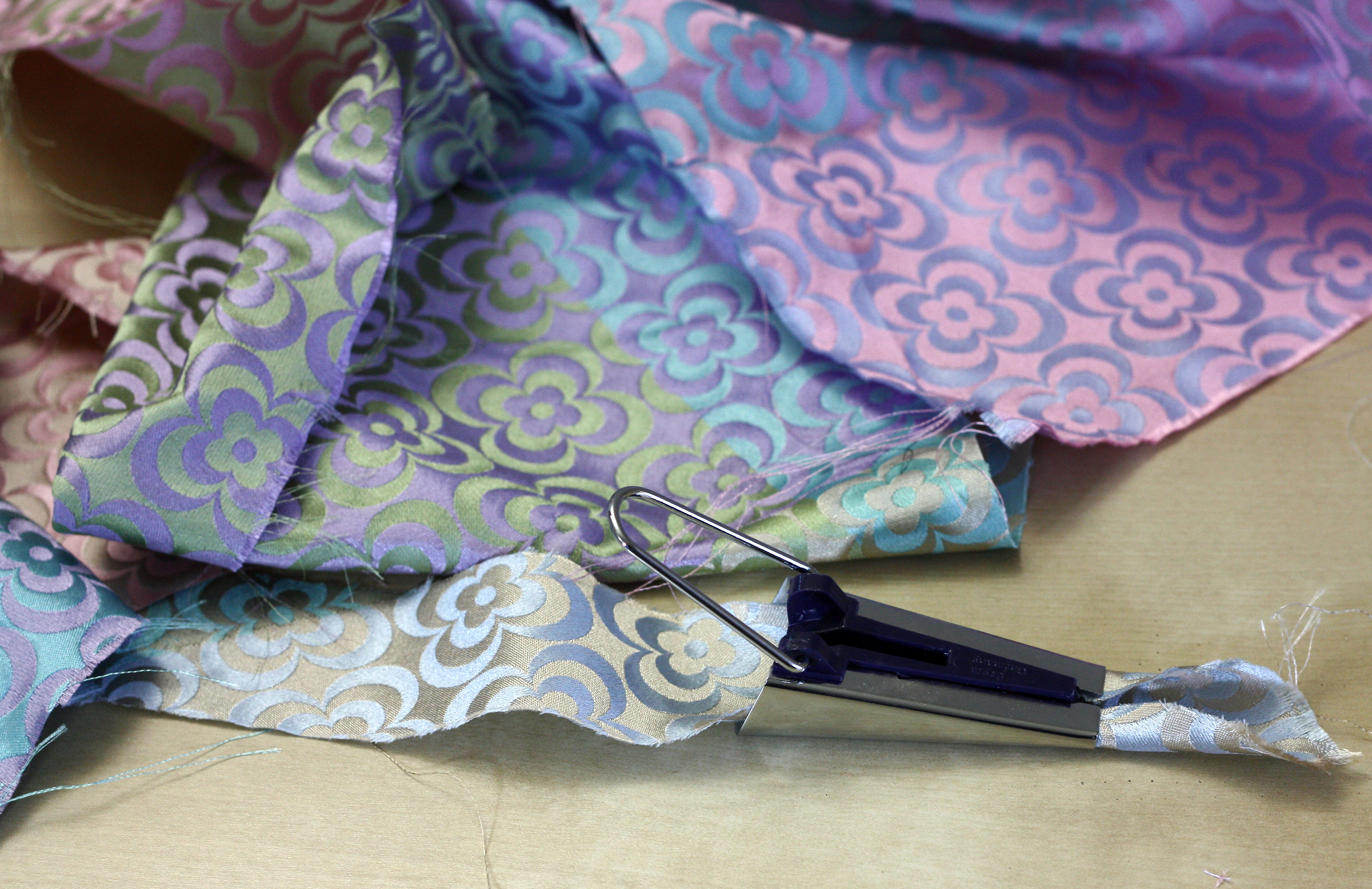 Avec ces soies, j’ai commencé par préparer un long biais. J’avais un appareil à biais de 18mm que je voulais utiliser depuis longtemps, c’était l’occasion rêvée!
