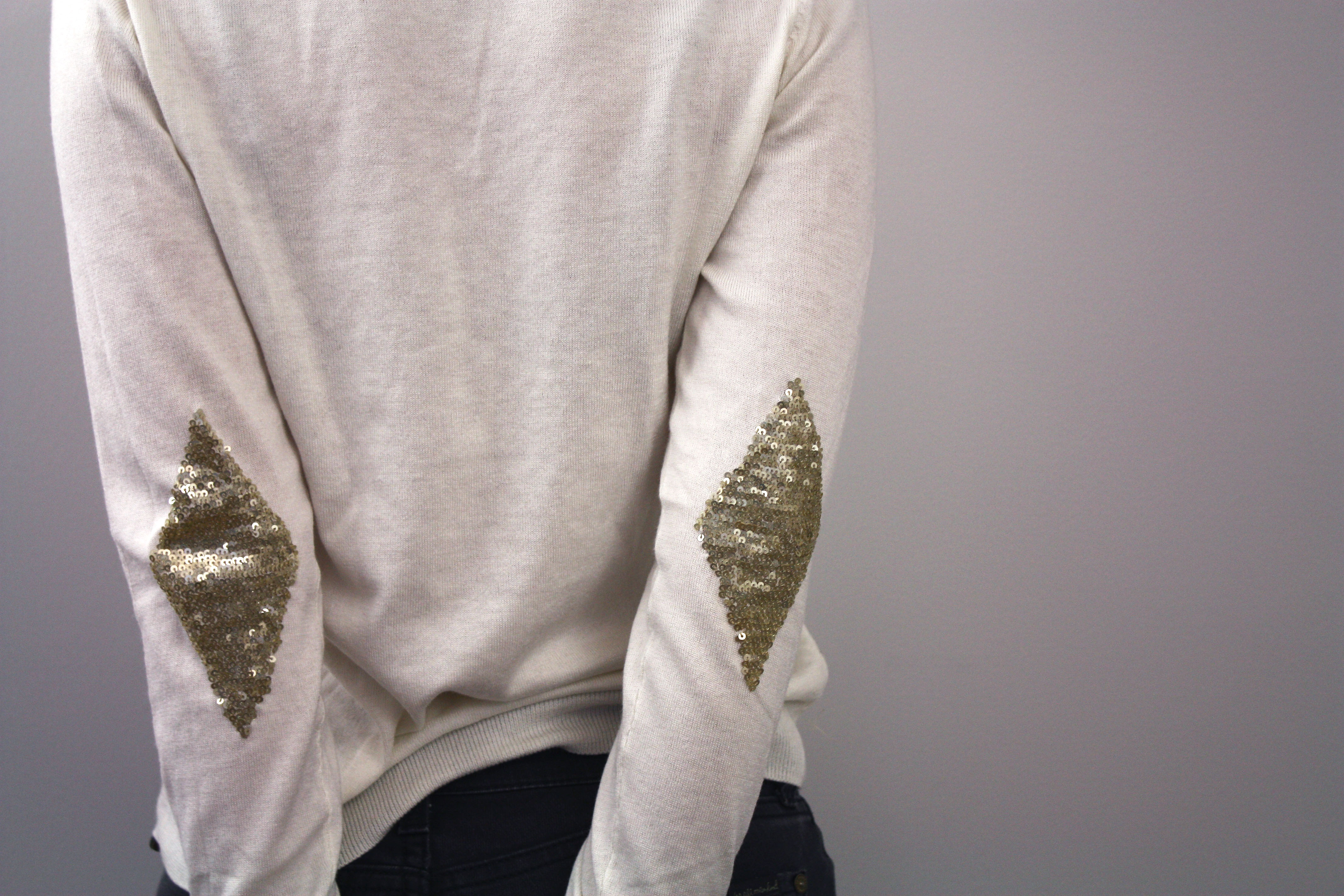 – dessinez la forme de vos coudières sur le pull et bâtir le contour du losange (ou de l’ovale) de vos coudières. Pour bâtir, il suffit de passer de grands points de couture en avant. La couleur, différente de celle du pull et des paillettes, vous aidera tout au long de votre ouvrage à de ne pas « dépasser ».
