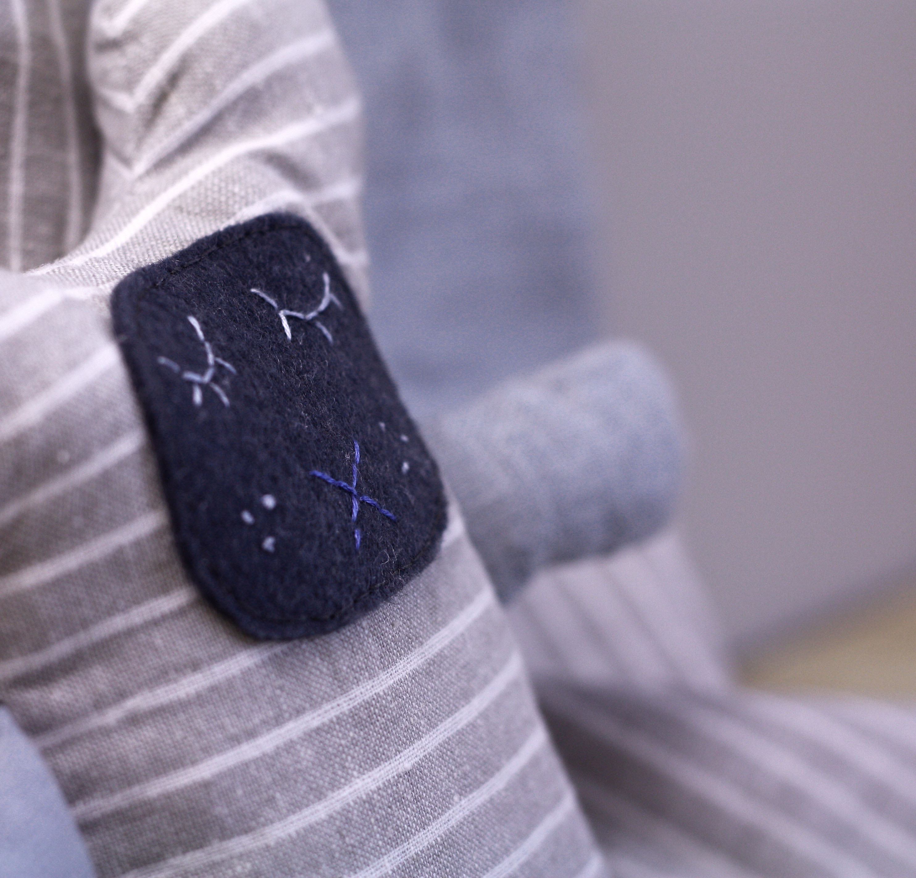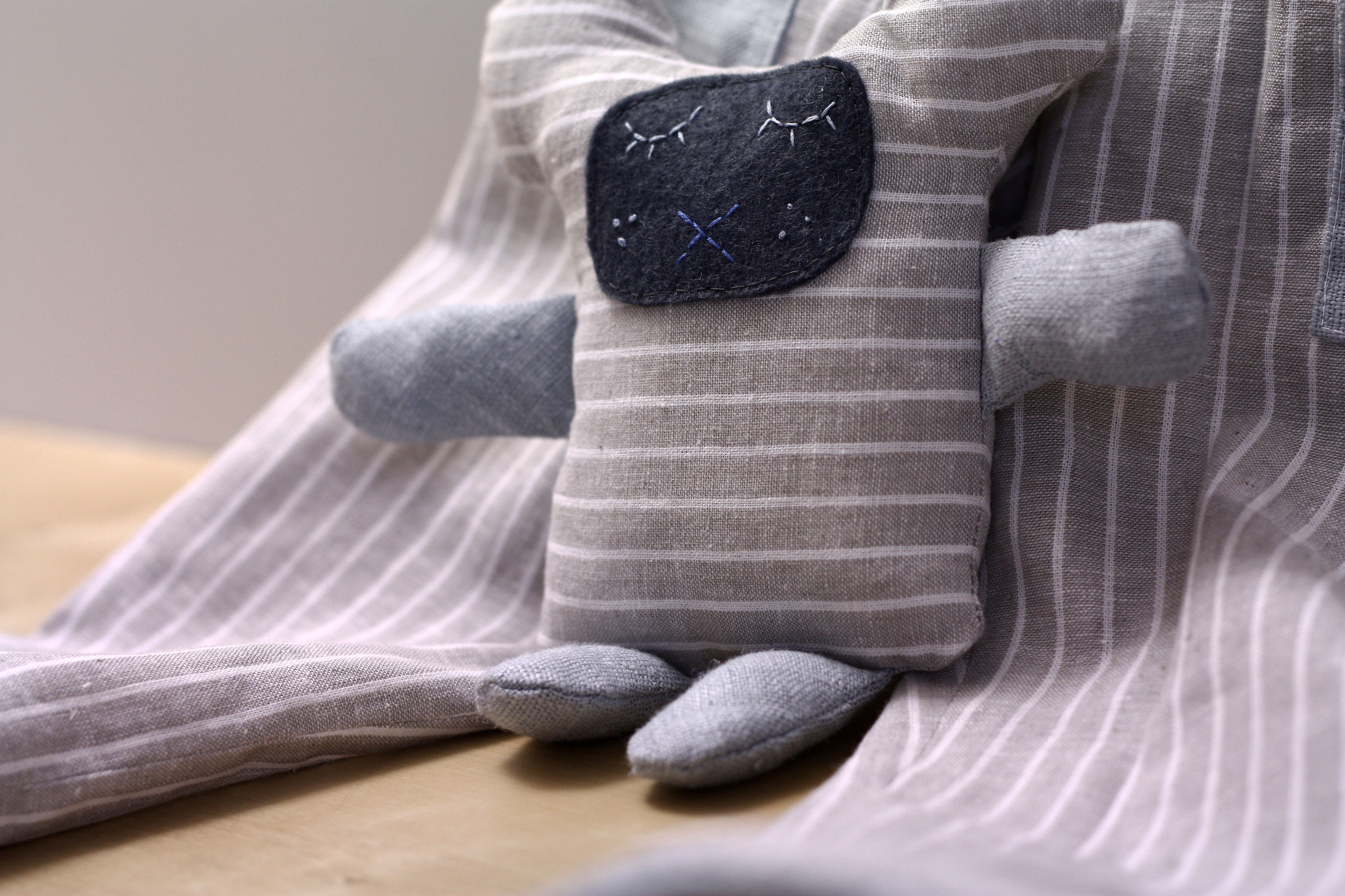 Le doudou de Clément est fait dans les mêmes tissus que le pantalon, seulement son visage est en feutrine bleu-grise et les broderies sont faites à la main avec du fil de coton à broder DMC n°25.