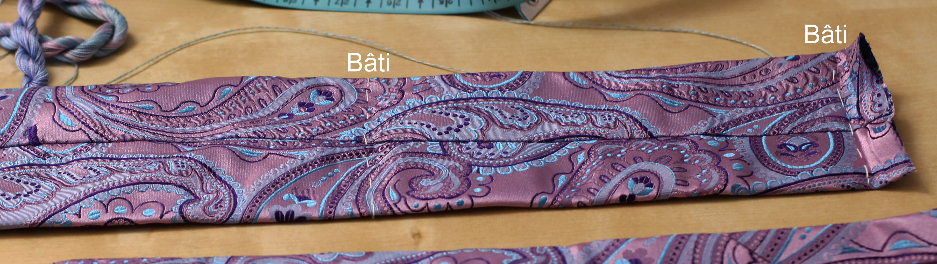 – Rabattre le bout de cravate vers le haut en préformant l’ourlet. Placer quelques épingles pour bloquer les tissus et coudre tout autour au point glissé de la manière la plus discrète possible.