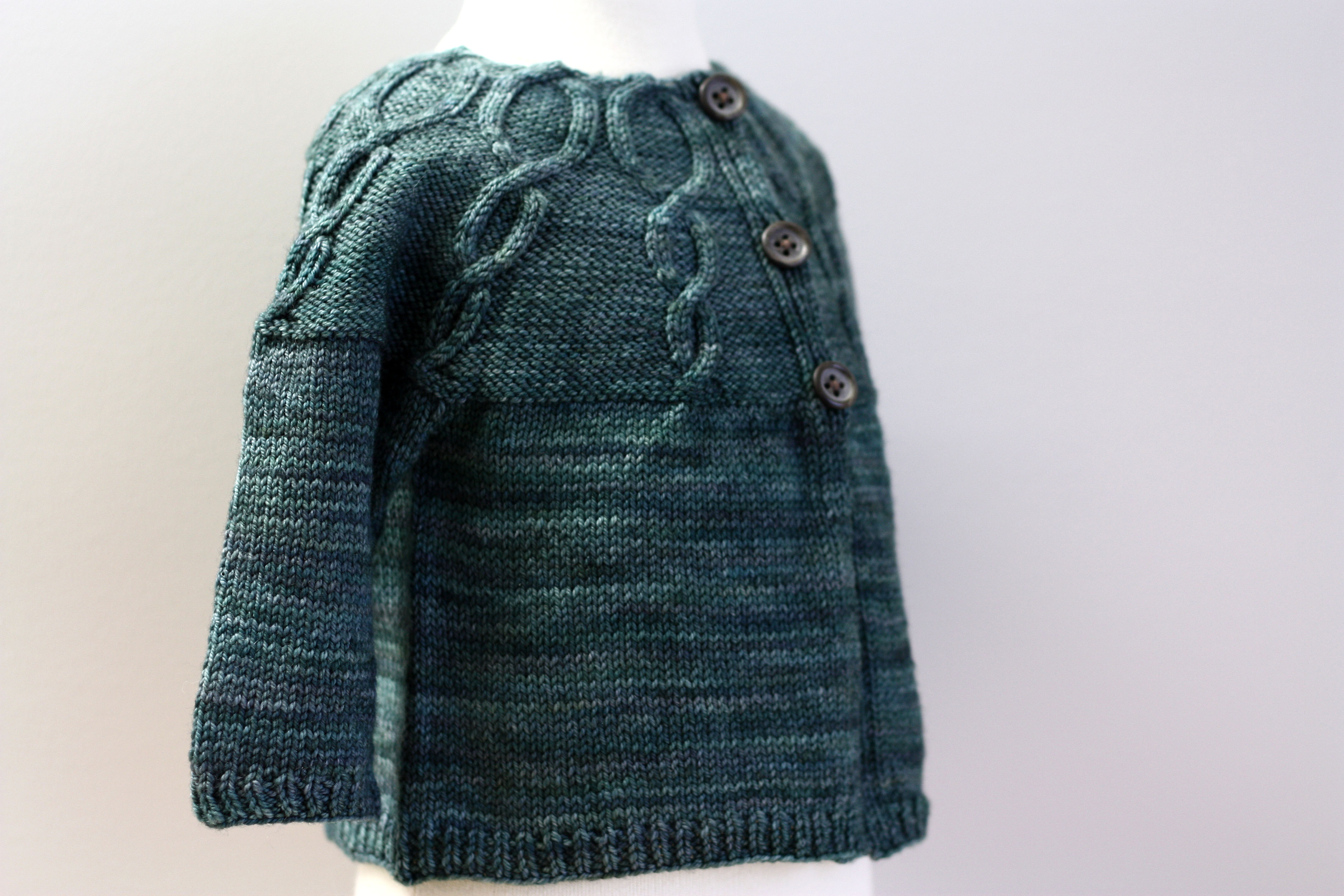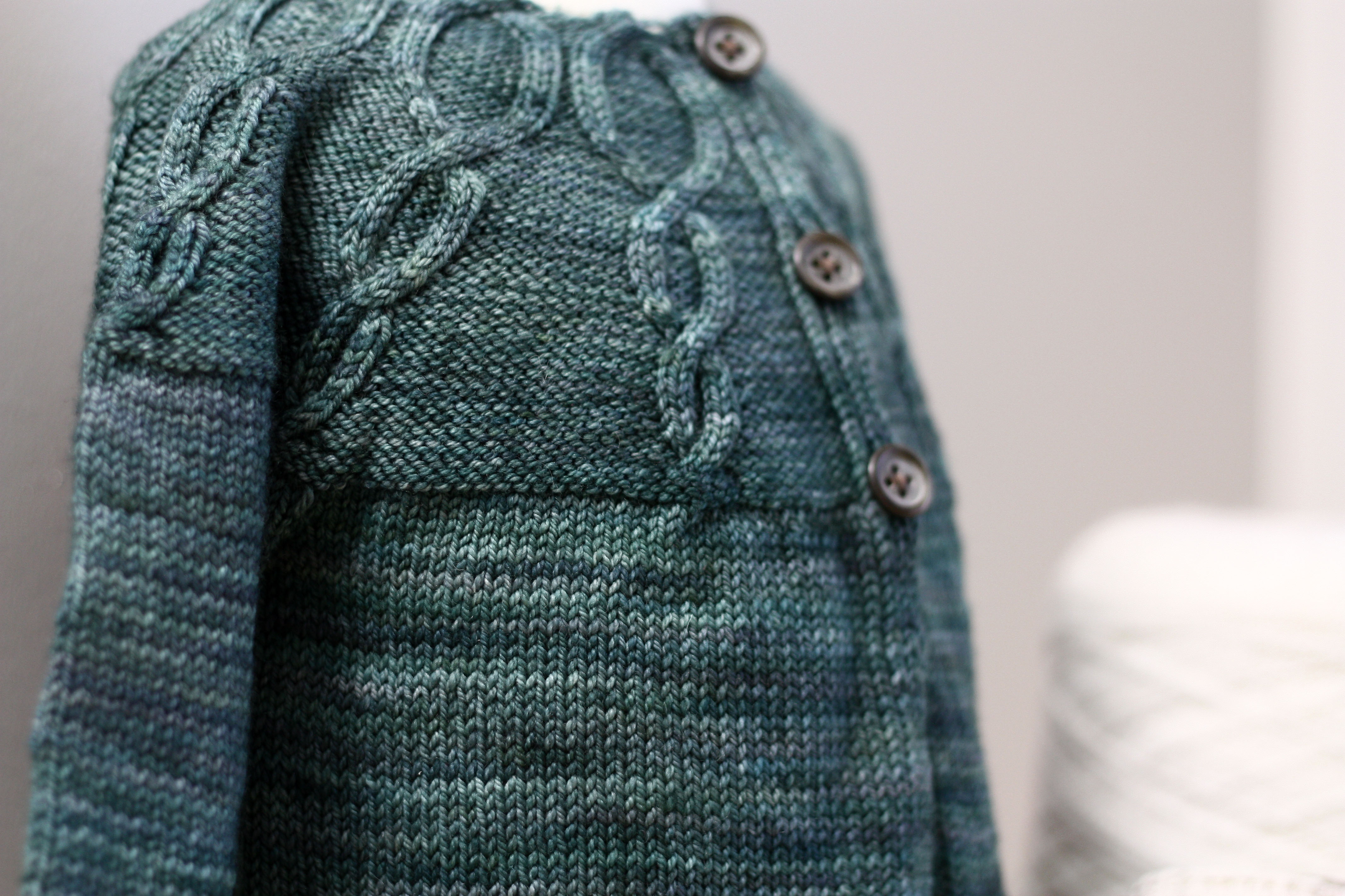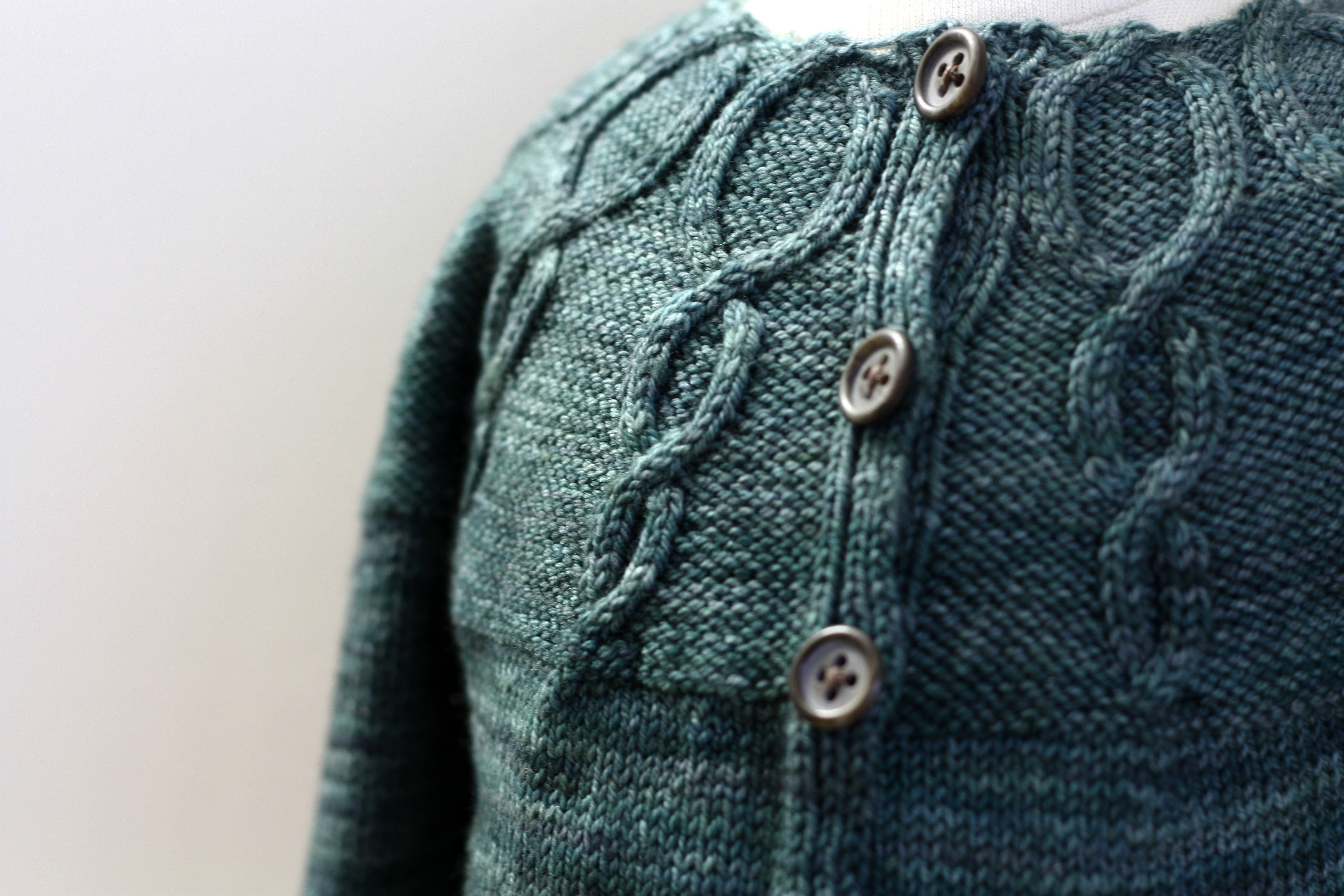 Si vous souhaitez réaliser ce modèle vous aussi, vous trouverez le patron là. J’ai utilisé la laine Malabrigo Sock coloris Aquas. Je voyais une couleur qui tirait un peu plus vers le turquoise sur la photo mais finalement j’aime beaucoup ce vert profond. Les petits boutons sont des boutons de veste d’homme de mon stock.